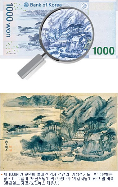 한국은행이 새로 발행된 1000원권 지폐에 실린 겸재 정선의 그림 ''계상정거도(溪上靜居圖)''의 실제 장소가 어느 곳인지 아직까지도 결론을 내리지 못하고 있는 것으로 확인됐다. 부실한 고증작업으로 ''어디를 그린 것인지도 모르는'' 그림을 지폐 도안에 사용한 셈이다.