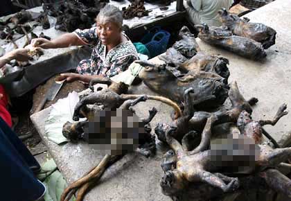 카메룬의 한 재래시장에서 거래되는 원숭이고기