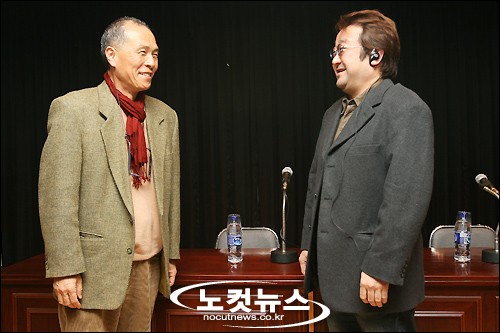 ''식객''의 허영만 화백(왼쪽)과 ''미스터 초밥왕''의 저자 테라사와 다이스케가 3일 오후 서울 안국동 주한일본대사관 공보문화원에서 가진 대담에 앞서 밝은 표정으로 인사를 나누고 있다.