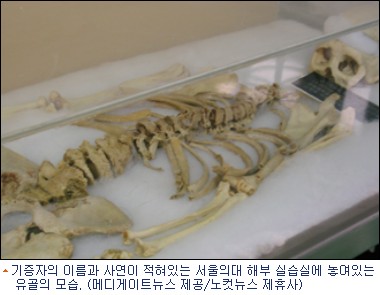 기증자의 이름과 사연이 적혀있는 서울의대 해부 실습실에 놓여있는 유골의 모습.