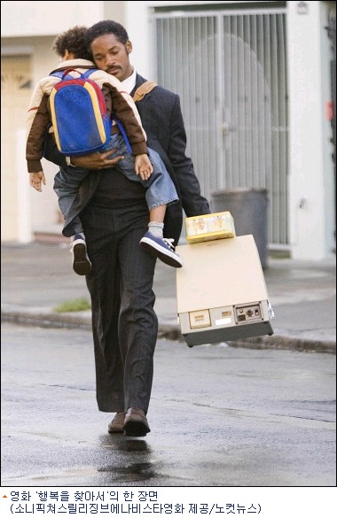 기억 속의 윌 스미스는 지워라열심히 일하지만 하루하루 먹고 사는 것 자체가 힘겨운 이 가장의 모습은 아들(제이든 스미스 분)의 고개 숙인 모습과 생활에 대한 불안으로 신경질적인 어머니(린다 가드너 분)의 앙칼진 목소리와 뒤섞여 서글픔이 뚝뚝 묻어나게 만든다.