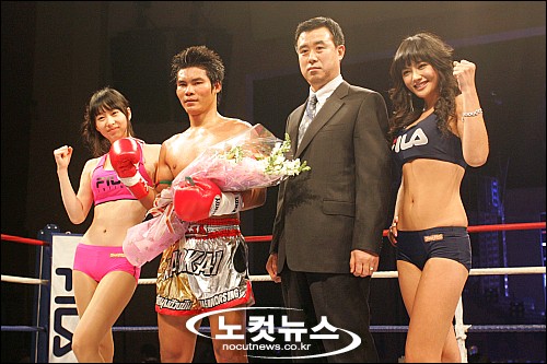 카오클라이가 18일 오후 서울 올림픽 공원 올림픽 홀에서 열린 K-1 파이팅 네트워크 칸 2007 챔피언쉽대회 수퍼파이트에서 박용수를 맞아 연장전까지 가는 접전끝에 판정승으로 승리한 뒤 기념촬영을 하고 있다.