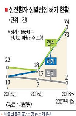 대법원은 지난해 6월 처음으로 성전환자의 성별정정 신청을 받아들인 뒤 같은 해 9월 ''성전환자의 성별정정허가 신청사건 등 사무처리지침''을 제정했다. 지침은 ▲만 20세 이상, 혼인 사실이나 자녀가 없을 것 ▲정신과 또는 호르몬 요법에 의한 치료를 받은 뒤 수술을 통해 신체 외관이 반대 성으로 바뀌었을 것 ▲병역을 이행했거나 면제받을 것 등을 규정하고 있다.