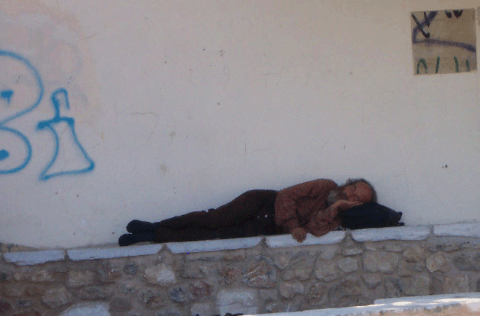 길거리 그늘에서 무조건 누워 자고 있는 그리스인 (아테네=김한규 명예기자)