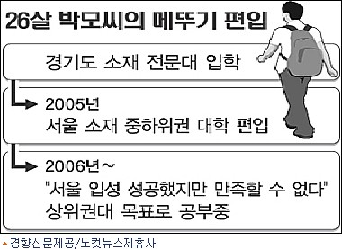 박모씨(26)는 올해 또 한번 대학 편입시험에 도전할 계획이다. 경기도 소재 전문대 경영학과에 다니던 박씨는 2005년 서울 ''중하위권'' ㅅ대 경영학과로 편입했다.