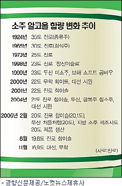 13일 업계에 따르면 ''부드러운 목 넘김''을 지향하는 소주는 30도 부근에서 최근에는 20도 안팎으로까지 도수가 낮아졌다. 이와 달리 ''''술다운 술''''을 고집하며 도수를 22도까지 올린 소주와 6.9도로 높인 맥주도 출시됐다.