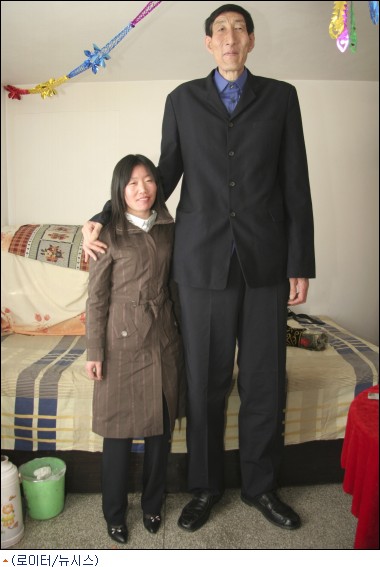 28일(현지시각) 로이터통신은 중국 베이징 뉴스를 인용, 2m36㎝의 키로 ''현존하는 세계 최장신''으로 기네스북에 등재된 중국인 바오 시순(56)이 키 1m68cm의 ''아담한'' 신부 샤 수젠(29)과 혼인신고를 했다고 보도했다.