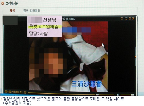 서울 수서경찰서는 경쟁 입시학원 홈페이지 게시판에 음란물을 올리고 여강사들 프로필을 음란한 말로 바꿔치기 한 혐의로 강남의 한 입시학원 부원장 이 모(34)씨에 대해 구속영장을 신청했다.