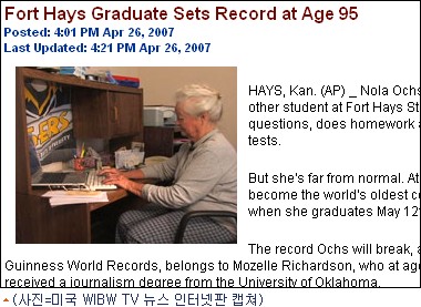 미국 캔사스 주에 사는 올해 95살의 놀라 오츠스 할머니가 다음달 대학 졸업장을 받을 예정이다.