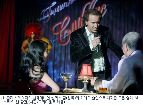 이 영화에서 2분마다 미래를 내다볼 수 있는 특별한 능력을 갖춘 라스베이거스의 마술사로 변신한 케이지는 작품에 자신의 실제 아내인 앨리스 김을 출연시켜 눈길을 끌고 있다. 한국계인 앨리스 김은 영화 초반의 마술쇼 장면에 자신의 한국이름인 ''''용경''''이란 이름 그대로 깜짝 출연한다.