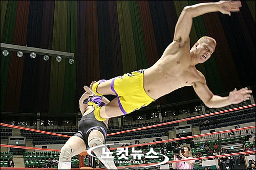15일 오후 서울 장충체육관에서 ''故 김일선생님 추모 세계 프로레스링 대회''가 열린 가운데 선수들이 화려한 경기를 선보이고 있다.