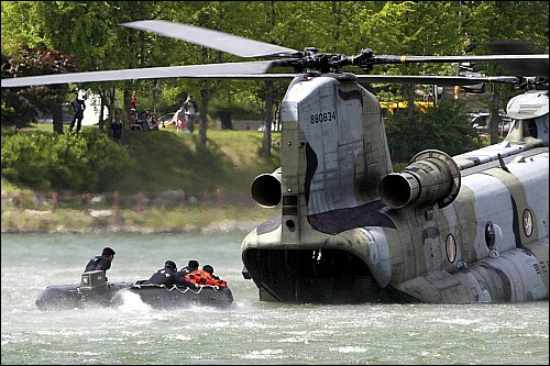 육군 항공작전사령부는 25일 오후 경기도 이천시 설봉공원에서 민.관.군 통합 재난대응훈련을 실시, CH-47 시누크 헬기가 인명구조 행동시범을 보이고 있다.