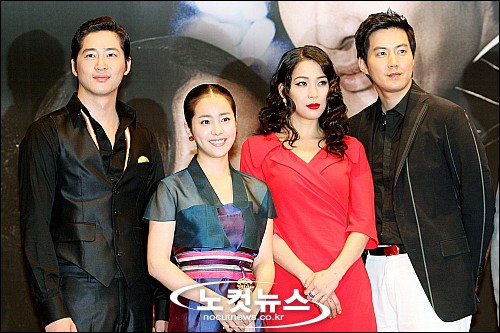 30일 오후 서울 여의도 전경련회관에서 열린 KBS 새 수목드라마 ''경성스캔들''(연출 한준서, 극본 진수완) 제작발표회에서 주연배우인 (왼쪽부터) 강지환, 한지민, 한고은, 류진이 취재진을 향해 포즈를 취하고 있다.