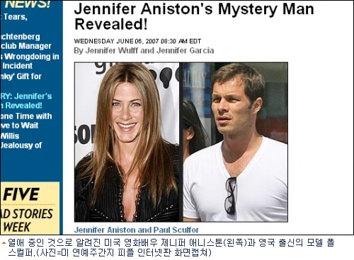 6일(현지시각) 미국의 연예주간지 피플 인터넷판은 지난 몇 주간 애니스톤과 데이트를 해 온 ''미스터리의 남성''이 영국 출신의 모델 폴 스컬퍼(36)라고 소개하며 두 사람의 열애 소식을 전했다.[BestNocut_R]