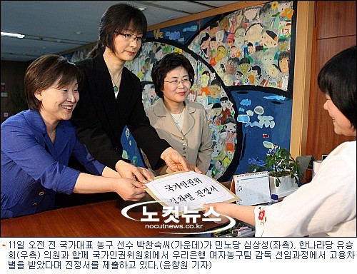 이와 관련해 기자회견에 함께 참석한 민주노동당 심상정 의원은 "최근 우리은행 여자농구팀 전임 감독이 소속 선수를 성추행한 혐의로 구속된 사건은 스포츠계에서 남성 감독과 여성 선수 사이에 관행화된 성폭력 문제를 보여주고 있다"며 "여성스포츠 분야에 여성 지도자가 들어설 자리를 마련하는 게 시급하다"고 말했다.