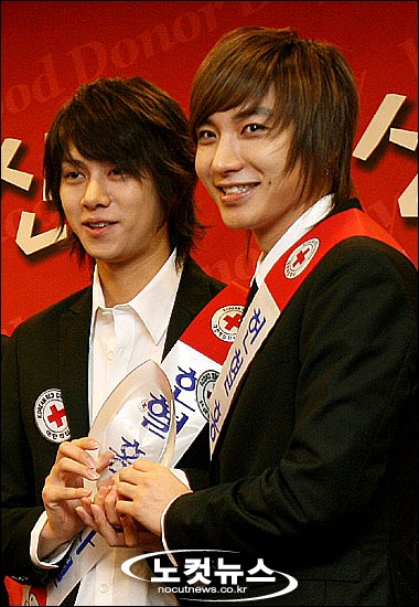 14일 오전 서울 광화문 세종문화회관 세종홀에서 열린 ''제4회 세계헌혈자의 날'' 기념식에서 헌혈홍보사절로 위촉된 슈퍼주니어의 김희철(왼쪽)과 이특이 위촉패를 받은 뒤 취재진을 향해 포즈를 취하고 있다.