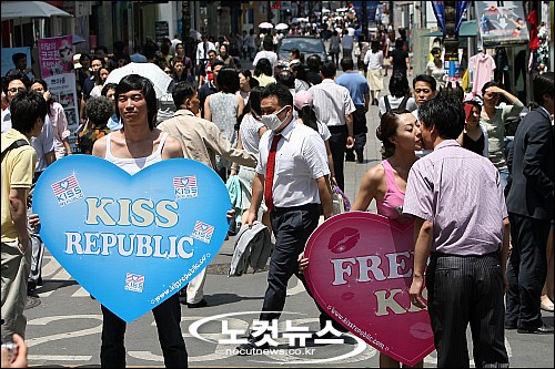 14일 서울 명동에서 키스데이를 맞아 거리를 지나다니는 시민들에게 키스를 해주거나 키스를 받는 프리키스 행사가 열리고 있다.