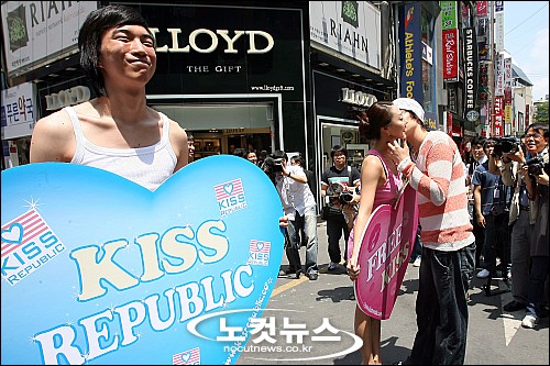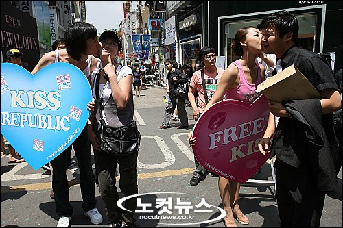 14일 서울 명동에서 키스데이를 맞아 거리를 지나다니는 시민들에게 키스를 해주거나 키스를 받는 프리키스 행사가 열리고 있다.