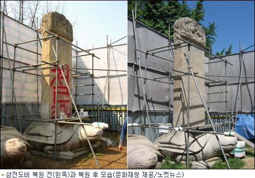 문화재청 국립문화재연구소(소장 김봉건)는 붉은색 페인트칠로 훼손된 삼전도비(사적 제101호)의 페인트를 제거해 보존처리를 완료했다고 15일 밝혔다.[BestNocut_R]