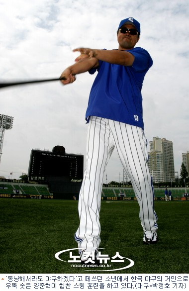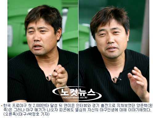 프로야구 삼성-현대의 3연전이 시작된 지난 15일 대구구장. 경기 전 만난 양준혁(38. 삼성)은 다소 피곤해보였다. 그도 그럴 것이 지난 9일 잠실 두산전에서 한국 프로야구 사상 최초로 2,000안타를 때려낸 뒤 수많은 인터뷰를 소화해야 했고 경기도 빠짐없이 치러야 했기 때문. 일주일 쉼없이 쬐던 언론의 따가운 조명에 잠시 시들했던 양준혁은 그러나 ''야구''(野球) 얘기가 나오자 이내 물먹은 화초마냥 금세 눈이 반짝, 활기가 돌았다.