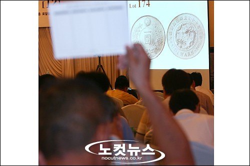 21일 오후 서울 서초구 반포 팔래스호텔 로얄볼룸에서 열린 희귀화폐 경매에서 ''태극휘장 1원 은화''가 3,050만원에 현장 입찰되고 있다.