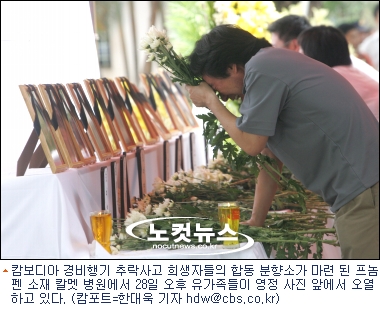 28일 비탄과 오열속에 추모식을 가진 캄보디아 비행기 추락사고 유족들이 29일밤 희생자들의 시신과 함께 우리나라로 향한다. 사고 원인에 대한 규명 작업도 한창이지만 정확한 사고 원인이 밝혀지는 데는적지 않은 시간이 걸릴 것으로 보인다.