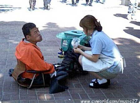 한 여성이 팔다리를 쓰지 못하는 장애인 노숙자에게 빵을 먹여주는 사진이 인터넷 상에 퍼지면서 네티즌들의 접속이 폭주하고 있다.