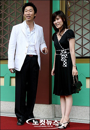 개그맨 겸 사업가 박승대가 9일 오후 서울 장충동 신라호텔에서 11살 연하 신부 송재연씨와 백년가약을 올리는 가운데 결혼식에 참석한 개그맨 김현기 부부가 취재진을 향해 포즈를 취하고 있다.