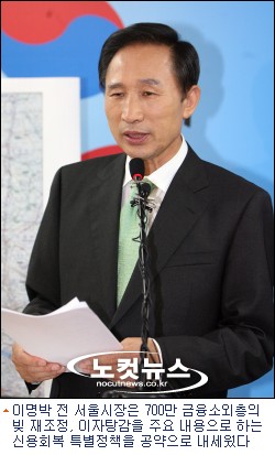 이명박 전 서울시장은 ''700만 금융소외계층의 빚을 재조정하거나 이자를 감면해 주고 연체기록을 말소하는 내용''을 뼈대로 하는 ''신용회복 특별정책''을 제시했다.