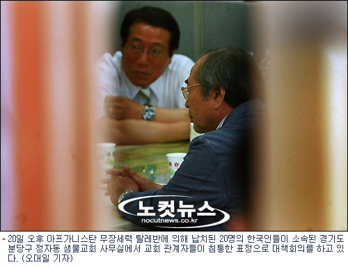 납치된 신도들이 소속된 샘물교회는 침통한 분위기 속에 교회 관계자들이 사무실 문을 굳게 걸어 잠근 채 대책을 숙의하고 있다.