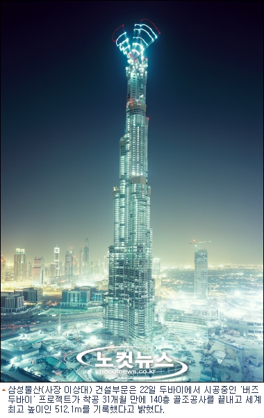 삼성물산(사장 이상대) 건설부문은 22일 두바이에서 시공중인 버즈두바이 프로젝트가 착공 31개월 만에 140층 골조공사를 끝내고 대만 TFC 101빌딩이 보유중인 508m 세계 최고층 기록을 4m 경신했다고 밝혔다.