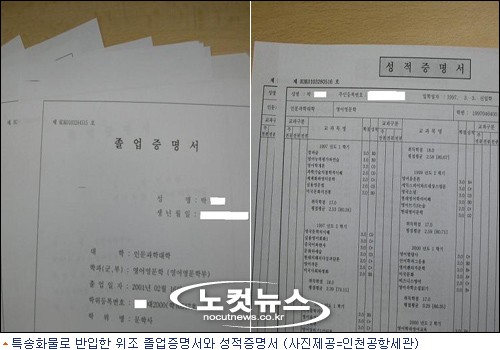인천공항세관에 따르면 최근 국내 유명대학의 가짜 졸업 증명서와 성적 증명서를 해외에서 만들어 밀반입하다가 적발되는 사례가 크게 늘고 있다.