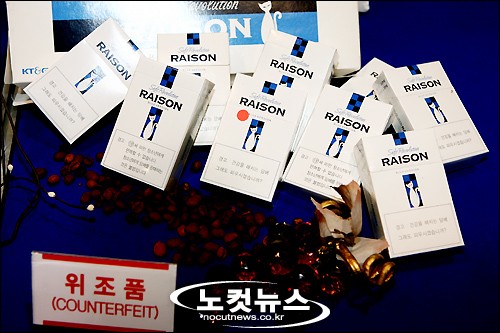 24일 오전 서울 삼성동 코엑스 대서양홀에서 열린 ''2007 위조상품 비교전시회''에서 위조 생산된 국산담배가 소개되고 있다.