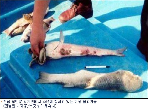 [BestNocut_L]26일 목포환경운동연합과 무안 청계만 인근 주민들은 "청계만에서 수년 전부터 등이 굽거나 피부가 정상적이지 않은 물고기들이 잇따라 잡히고 있으며, 최근 기형 물고기가 점차 증가하고 있다"고 주장하고 있다.