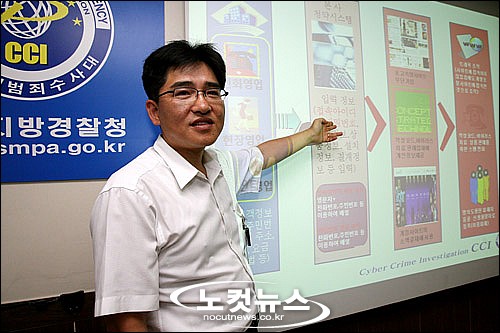 8일 오전 서울 종로 내자동 서울지방경찰청 사이버수사대에서 통신회사들의 고객정보 유출 및 부정 사용해 자사 포털 회원에 무단 가입등에 대해 장관승 지적재산권팀 팀장이 브리핑을 하고 있다.