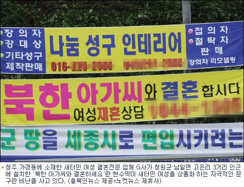 청주에도 현재 2개 업체가 성업 중이다. 청주·청원의 외곽지역에는 언젠가부터 바로 이 같은 업체들이 내건 ''''북한 여성(아가씨)과 결혼 하세요''''란 현수막이 나부끼고 있다. 이 홍보 문구가 새터민 여성의 인권을 경시하고 상품화 했다는 비난이 일고 있다. [BestNocut_R]