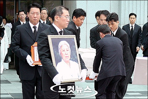 [BestNocut_R]고 정주영 전 현대그룹 명예회장의 부인 변중석(邊仲錫) 여사의 영결식이 21일 오전 서울 풍납동 아산병원 장례식장에서 가족장으로 치러진 가운데 영결식을 마친 뒤 정의선 기아자동차 사장(가운데)이 영정을 모시고 운구차로 향하고 있다.
