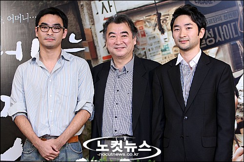 24일 오후 중구 대한극장에서 열린 영화 ''어머니는 죽지 않는다'' 시사 및 기자 간담회에서 하명중 감독이 두 아들(하준원프로듀서(좌측), 하상원 청년 최호역(우측))과 포토타임을 가지고 있다.