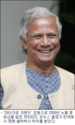 빈민층에게 무담보로 돈을 빌려주는 ''마이크로 크레딧'' 운동으로 2006년도 노벨 평화상을 받은 무하마드 유누스 그라민은행 총재가 한국에서 명예 철학 박사학위를 받게 된다.[BestNocut_R]