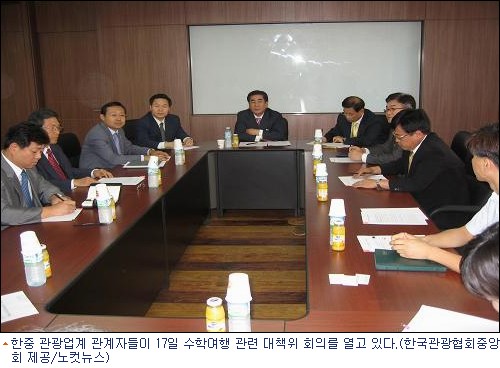 한국관광협회중앙회는 17일 오전 한국관광협회중앙회 대회의실에서 정소웅 한국수학여행협회 사무국장, 장서룡 중국국가여유국 서울지국장, 이보영 여유국과장, 김영수 일반여행업협회 사무처장, 김종욱 국외여행업위원장, 편흥진 경기도관광협회 사무국장 등이 참석한 가운데 대책위 구성 및 회의를 가졌다. [BestNocut_R]