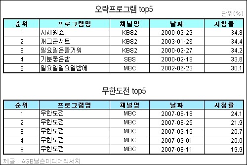 노컷뉴스가 조사한(AGB닐슨 자료기준) 2000년 이후 역대 시청률 30% 이상 예능 프로그램을 살펴보면 2000년 2월 ''서세원쇼''가 가장 높은 34.8%를 기록한 이후 2003년 1월 개그 콘서트의 34.4%를 마지막으로 30%를 넘어선 예능프로그램이 전무했다. 베스트 시청률 5위까지중에서 MBC는 2002년 6월 ''일요일 일요일밤에''의 30.1%가 유일한 마지막이었다. 드라마와 비교해 제작비 대비 높은 효율을 보이고 있는 예능 프로그램의 30% 돌파는 향후 방송사의 제작 방향에 중요한 바로미터가 될 수 있다는 점에서 중요하다.