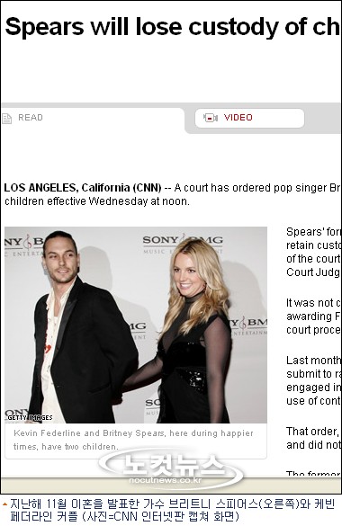 1일(현지시각) 미국 CNN 인터넷판에 따르면 스피어스는 이날 전(前) 남편 케빈 페더라인(29)과의 사이에서 낳은 두 아이에 대한 양육보호권을 이번주 내로 페더라인에게 넘기라는 법정 판결을 받았다. 그간 벌여온 양육권 분쟁에서 패소한 셈이다.