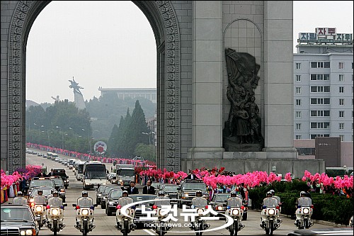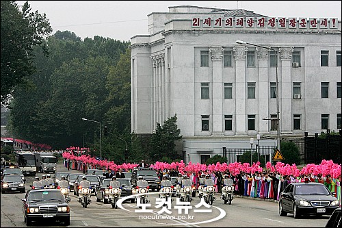 노무현 대통령과 김영남 최고인민회의 상임위원장이 2일 낮 무개차를 타고 평양시내를 달리고 있다.
