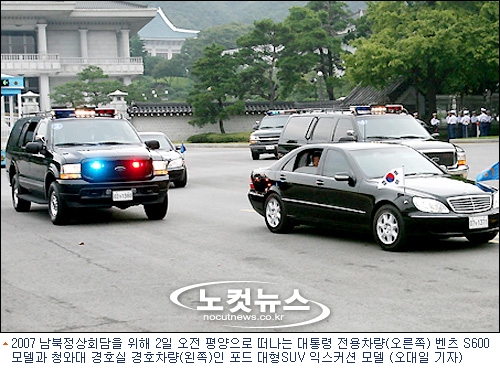 이날 노대통령이 첨단 방탄차인 ''벤츠 S600 가드''에 탑승해 청와대 정문을 나서자 바로 뒤에 두 대의 경호차량이 경광등을 번쩍이며 경호에 나섰다. 이 차량은 포드사의 SUV인 ''익스커션(Excursion)''으로 미국을 비롯한 세계 각국 원수들의 경호차량으로 인기를 끌고 있는 모델이다.