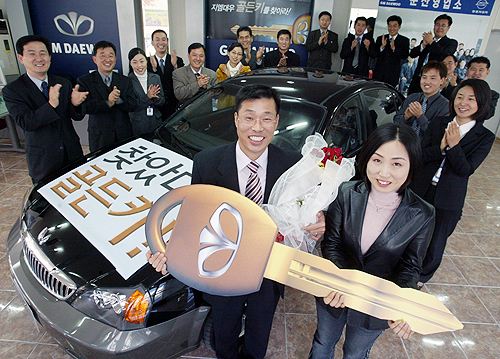 대우자판 김연진(金蓮眞, 사진 오른쪽)영업사원이 배포한 모형키로 최재홍(崔在弘, 사진 왼쪽)씨가'매그너스 골든키' 제1호로 당첨되어 함께 기념 촬영을 하고 있다.(GM대우 제공)