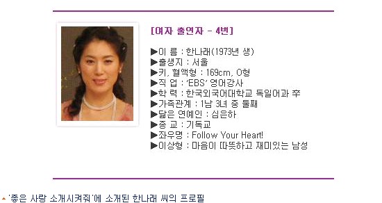 ''좋은 사람 소개시켜줘''에 밝힌 프로필에 따르면 한 씨는 한국 외국어대 독일어과를 졸업한 EBS 영어 강사로 1남 3녀 중 둘째다. 한씨는 현재 EBS English TV에서 미국 ABC방송사의 ''월드 뉴스 리뷰(World News Review)''를 진행하고 있으며 한국사이버대학 실용영어학과 교수직을 맡기도 했다. 레이한이라는 필명으로 영어 교재도 집필했다.