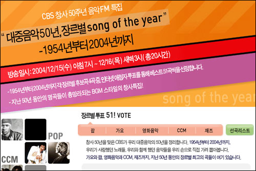 CBS FM은 창사 50주년을 맞아 국내 최초로 연도별, 장르별로 인기곡을 뽑는 ''최고의 노래(song of the year)'' 네티즌 투표를 벌이고 있다.