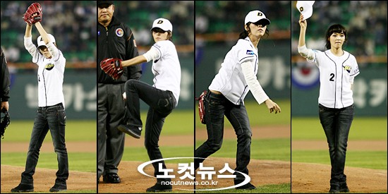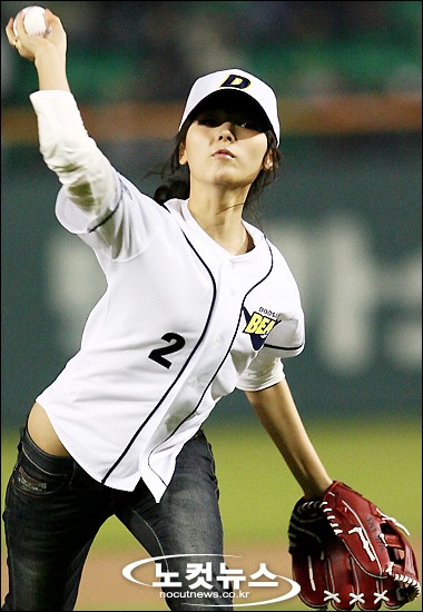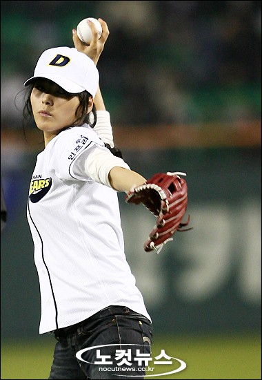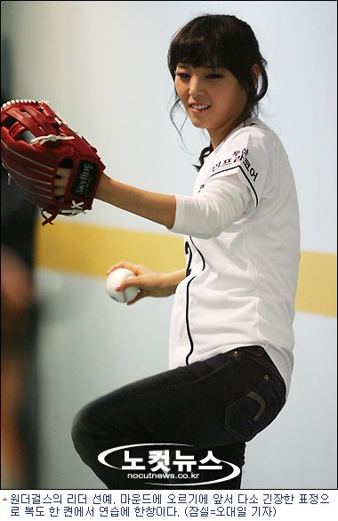 25일 오후 서울 잠실야구장에서 열린 2007 프로야구 한국시리즈 3차전 두산-SK의 경기에 앞서 5인조 여성 아이돌그룹 원더걸스의 리더 선예(18)가 멋진 자세로 시구를 하고 있다.