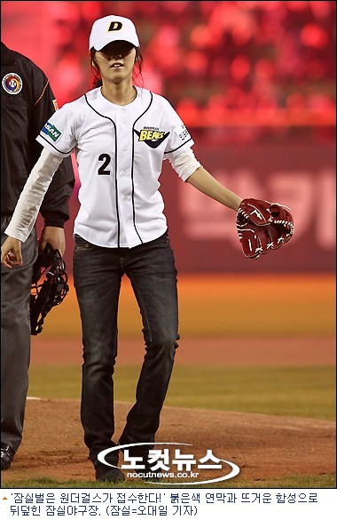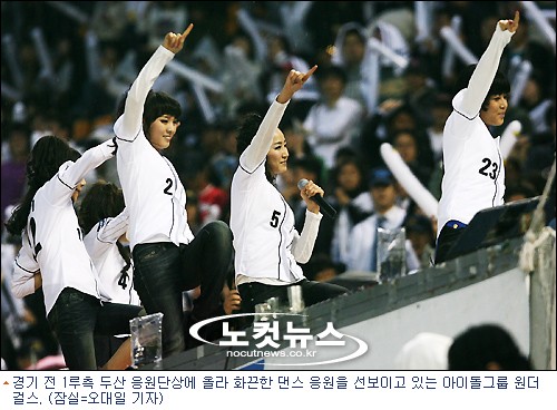 [BestNocut_R]복고풍 댄스곡 ''텔 미(Tell Me)''로 텔미 댄스 신드롬을 불러일으키는 등 폭발적인 사랑을 받고 있는 원더걸스는 홈팀 두산의 유니폼을 입고 마운드에 올라 잠실벌을 찾은 관중들의 우뢰와 같은 박수를 받았다.