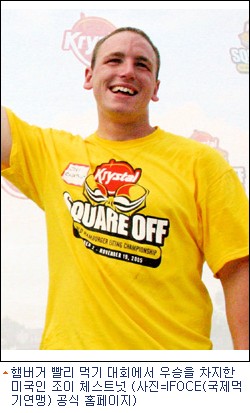 화제의 주인공인 미국 캘리포니아주 산호세에 사는 조이 체스트넛(23)으로, 그는 미국의 ''크리스털(The Krystal Co.)''사가 주최로 열린 ''세계 햄버거 먹기 경연대회''에서 2.5인치(6.35cm)크기의 미니 햄버거를 8분 만에 103개나 먹는 데 성공, 대회 신기록을 수립했다.